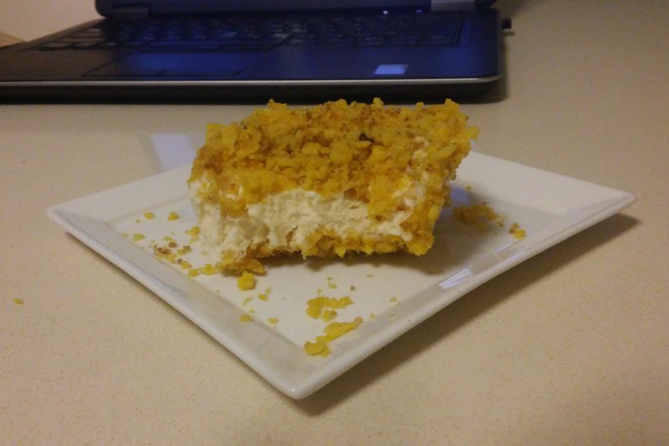 מערבבים את שברי הקרונפלקס עם הסוכר והשמן ואופים בתנור כרבע שעה. מקציפים את הביצים עם 1/4 כוס סוכר ואת הריצ עם שאר הסוכר ושאר החומרים. מערבבים את שתי ההקצפות. מסדרים שכבה של פירורים, גלידה ופירורים.