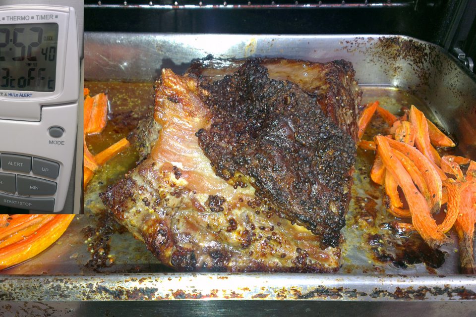 צריך לצאת אדום ורדרד מבפנים – אם יוצא well done צריך לקצר את האפייה בחום הבינוני. (תלוי תנור וגודל נתח)