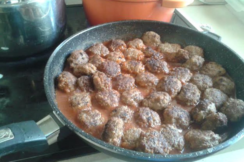 להוציא את הקציצות מהמחבת. להוסיף רסק עגבניות עם מים, ולהחזיר את הקציצות למחבת.